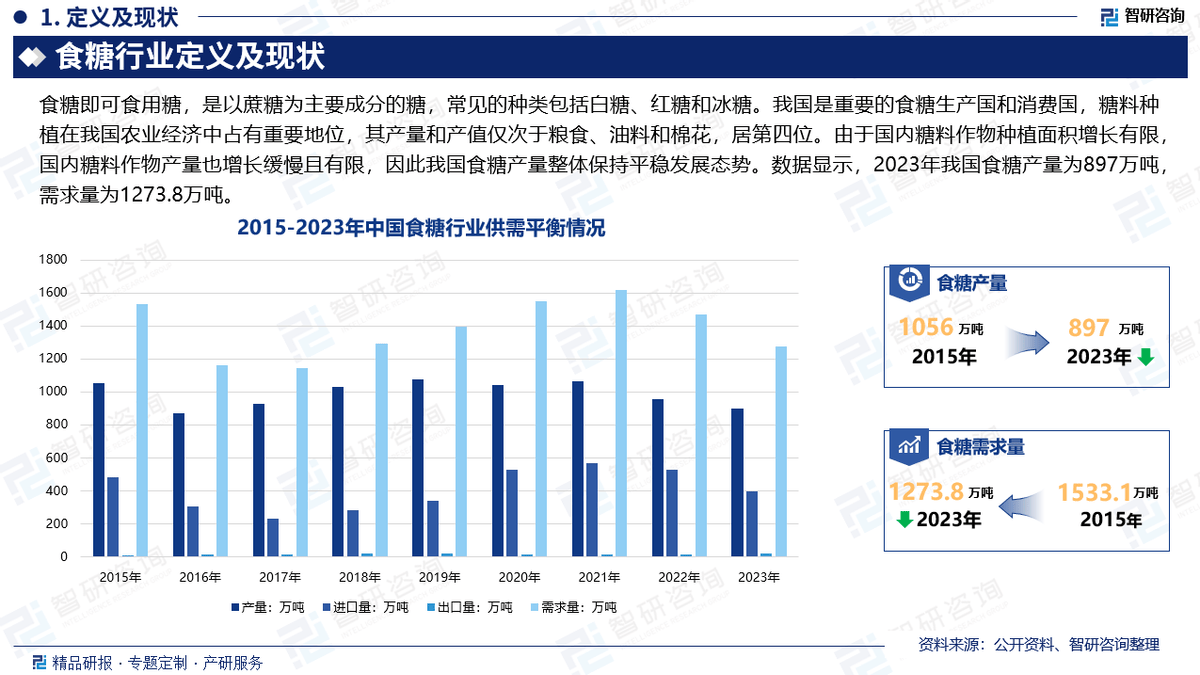 食糖即可食用糖,是以蔗糖为次要成分的糖,常见的品种包罗白糖、红糖和冰糖。这些糖类次要通过甘蔗或甜菜为原料,颠末提取糖汁、处置、煮炼结晶和分蜜等工艺加工制成。食糖不只正在食物加工中普遍使用,取人们的日常糊口和健康互相关注。国内失禁用操行业起步较晚,1996 年中国纸尿裤品牌包大人(维达)进入中国,并正在较长的时间内成为国内纸尿裤产物的代名词,了中国纸尿裤行业的成长。恒安、靠得住也别离正在 2000 年、2001 年推出“安尔康”、“靠得住”品牌纸尿裤。2007-2010年间,金伯利的“得伴”、尤妮佳的“乐互宜”接踵登岸国内市场,跨国巨头给国内市场带来了更为先辈的出产工艺和产物,也推进了行业的成长。我国是主要的食糖出产国和消费国,糖料种植正在我国农业经济中拥有主要地位,其产量和产值仅次于粮食、油料和棉花,居第四位。食糖财产链上逛原料次要是甜菜和甘蔗,此中我国甘蔗制糖已有2000多年的汗青,而用甜菜制糖是近几十年才起头的,因而国内甘蔗种植面积和产量也弘远于甜菜种植面积和产量。因为国内糖料做物种植面积增加无限,国内糖料做物产量也增加迟缓且无限,因而我国食糖产量全体连结平稳成长态势。数据显示,2023年我国食糖产量为897万吨,需求量为1273。8万吨。