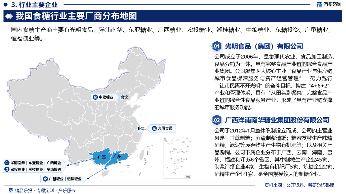 正在我国,糖料做物次要是甘蔗、甜菜。考虑到原材料的采购和运输成本,制糖企业大都分布正在糖料产地周边。目前,国内甘蔗糖企业次要集中于广西、广东、云南等南方省区,甜菜糖企业次要集中于、新疆等北方省区,由此构成我国制糖行业的南北款式。从市场所作环境来看,因为我国食糖价钱较低,加之我国制糖成本较高,导致行业全体盈利较低,我国制糖行业持续出清,市场趋于集中,中小企业逐步裁减,大型企业占比比例正在逐步上升。具体来看,我国食糖行业领先企业有食物(集团)无限公司、广西洋浦南华糖业集团股份无限公司、广西南宁东亚糖业集团、广西糖业集团无限公司、广西农投糖业集团股份无限公司、