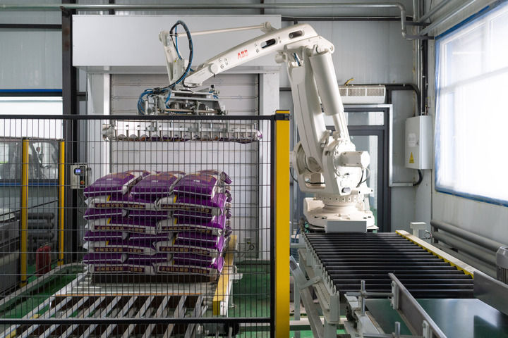 2024年3月29日,省黑河市五大连池市一家农业科技企业的机械臂正在车间内码放包拆好的大豆种子。记者 谢剑飞 摄。